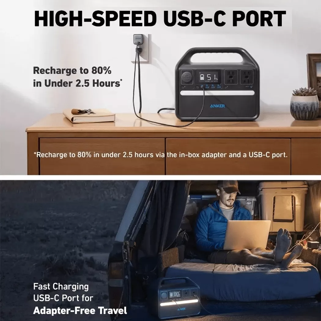 - 5 Ports for More Charging : Anker 522 Portable Power Station features 1 AC ports, 2 USB-C ports, a USB-A port, and a car outlet. Plug in up to 6 devices at once and charge anywhere