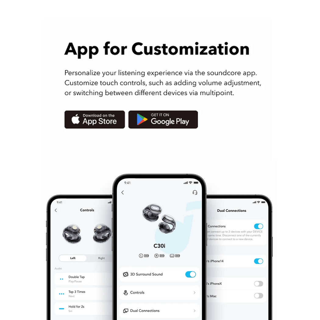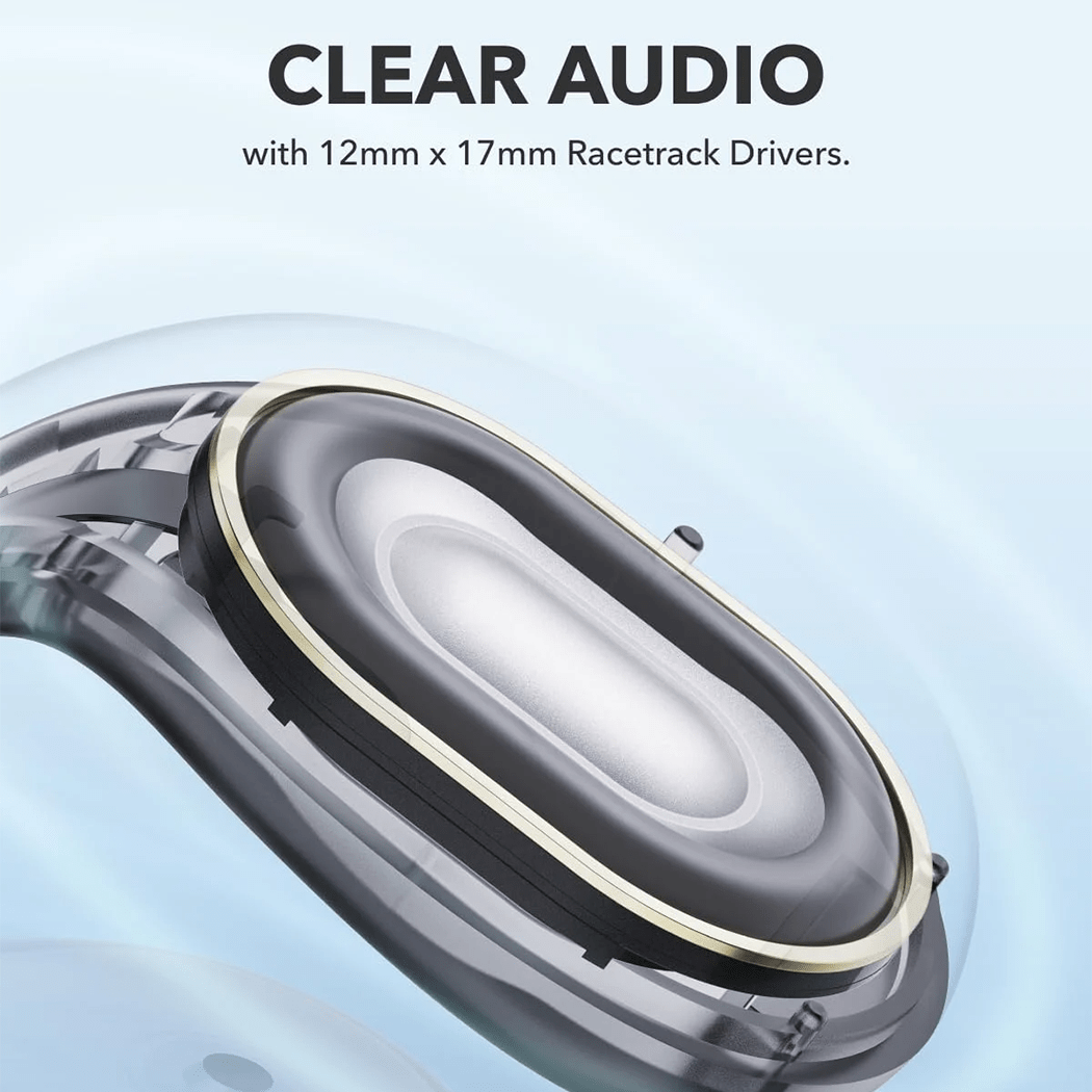 - Clear Audio : soundcore C30i boasts expansive 12mm × 17mm racetrack drivers. Coupled with a titanium-coated diaphragm, you can enjoy clear audio, even with open-ear listening.